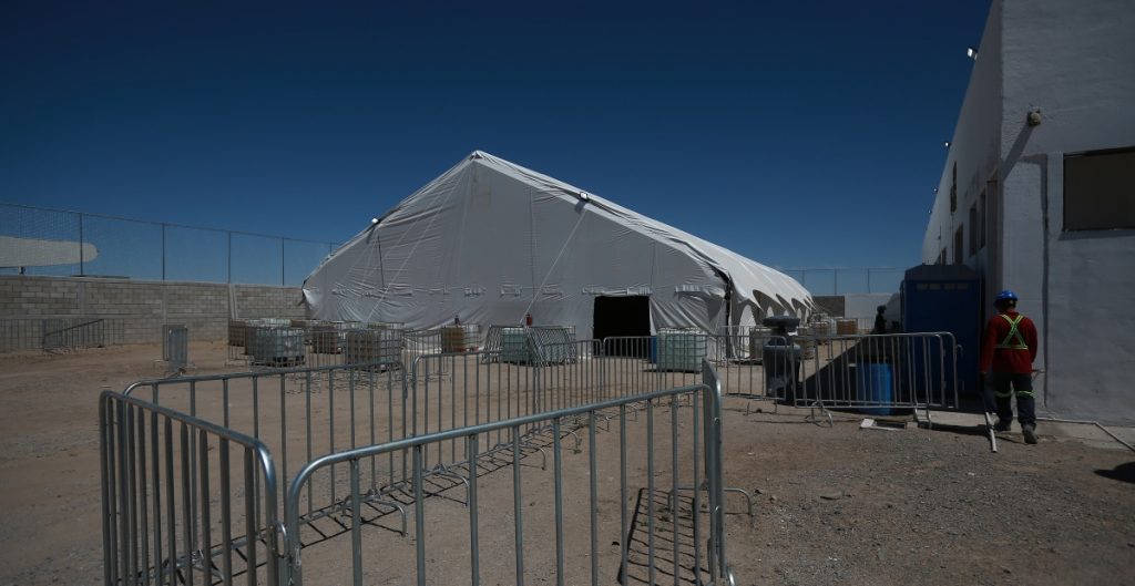 El albergue que construyen las autoridades migratorias está a 72 kilómetros de Ciudad Juárez, y consta de una carpa gigantesca y baños de plástico en unas instalaciones que fueron usadas como aduana antes, pero están abandonadas y vandalizadas desde hace más de 10 años.