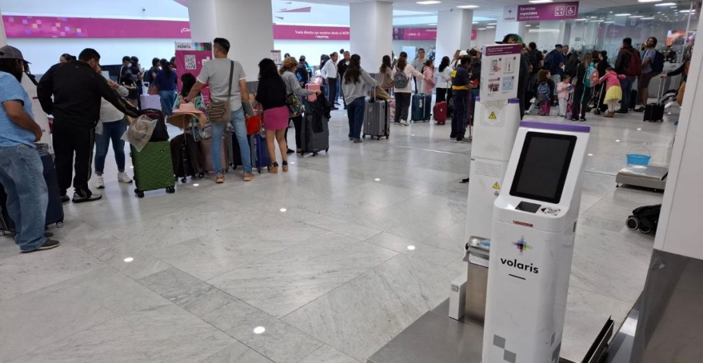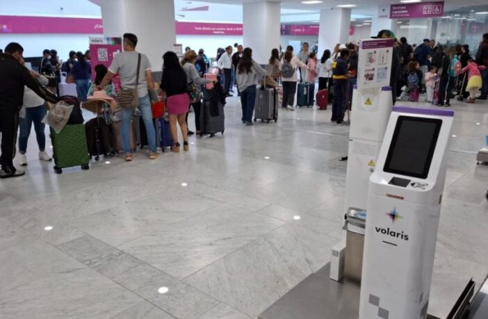 En las ventanillas de Volaris del AICM sus sistemas de registro y documentación no funcionan, hay largas filas de pasajeros que son atendidos de forma manual por el personal de la aerolínea.