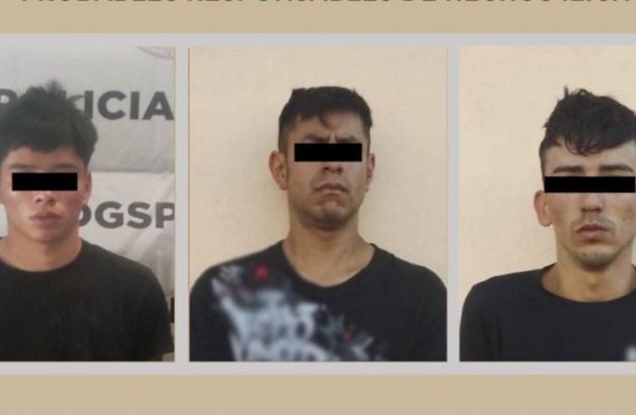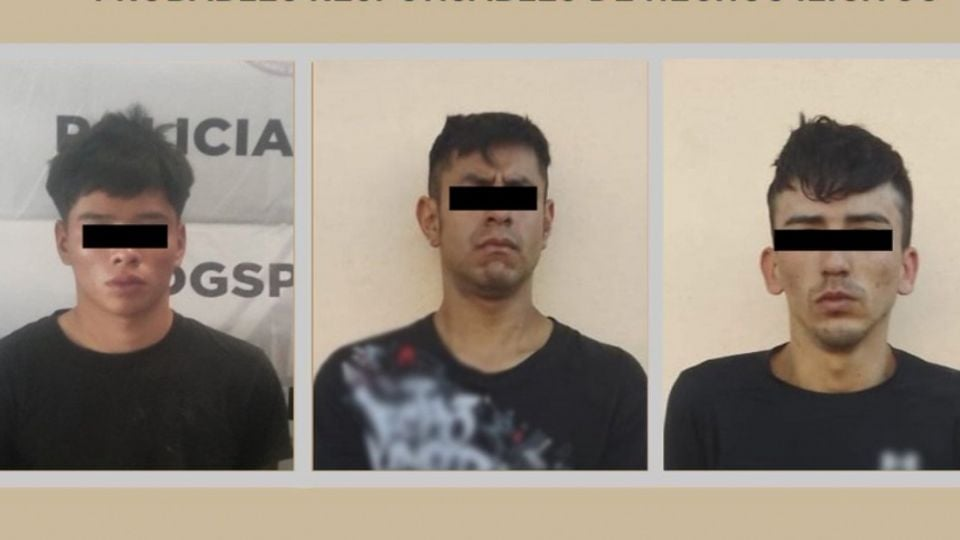 La policía detuvo a un menor de edad y a tres hombres identificados como Santiago “N”, de 20 años; Arturo “N”, de 24 años, y Eulices “N”, de 27 años, además, se les aseguraron “tres chalecos tácticos con seis placas balísticas, tres motocicletas de distintas marcas y una camioneta color blanco”.