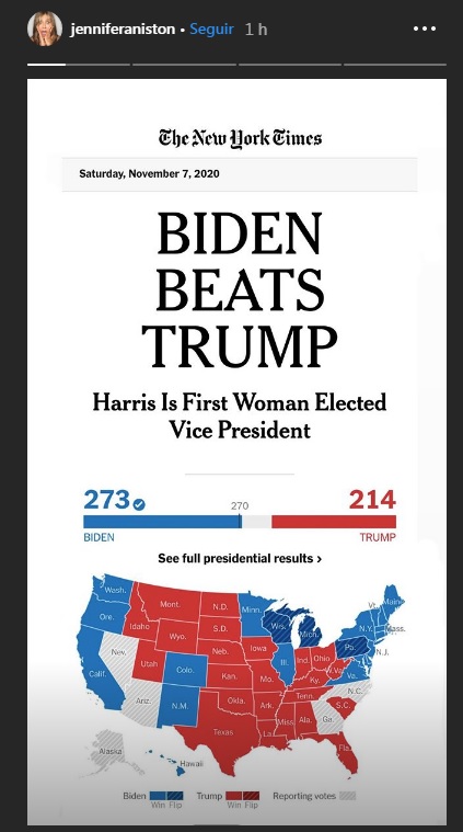 Lady Gaga, quien apoyó la campaña de Biden, reaccionó con una fotografía en sus redes sociales en la que felicitó al presidente número 46 en la historia de Estados Unidos