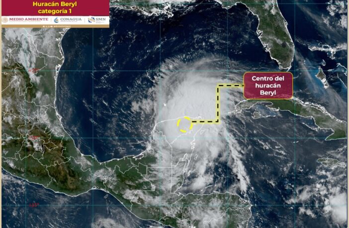 El huracán Beryl, que tocó tierra la madrugada de este viernes como huracán categoría 2, al norte del municipio de Tulum, Quintana Roo, en el Caribe mexicano, avanza en tierra como huracán categoría 1 sobre Yucatán, informó el Servicio Meteorológico Nacional (SMN).