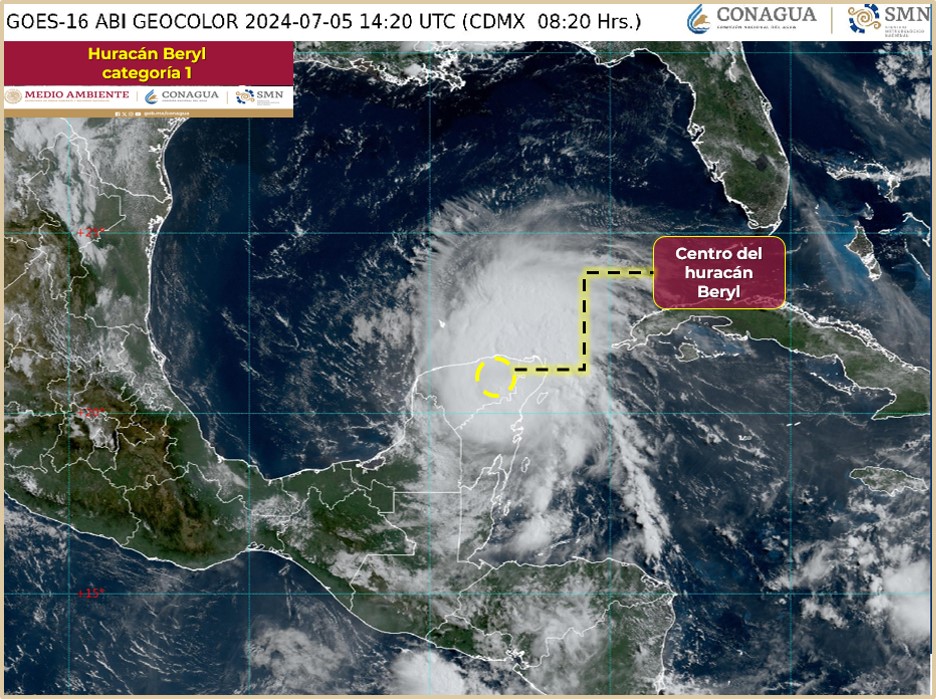 En su reporte más reciente, el SMN indicó que Beryl es ahora un huracán de categoría 1 en la escala Saffir-Simpson. Se localiza en tierra sobre Yucatán y sus bandas nubosas mantienen la probabilidad de lluvias intensas a torrenciales, vientos intensos, marea de tormenta y oleaje elevado en la Península de Yucatán”.