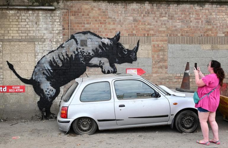 El artista británico Banksy desveló este lunes su octava obra de la serie ya bautizada como ‘zoo de Londres’, que ya encara su segunda semana en activo, con la silueta de un rinoceronte dibujada en una pared que parece que escala un coche aparcado en la acera.