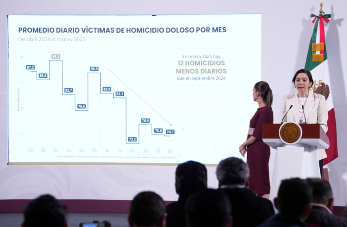 El promedio diario de asesinatos descendió a 74.7 en marzo frente a los 86.9 de septiembre de 2024, último mes del Gobierno de Andrés Manuel López Obrador (2018-2024), lo que implica 12 homicidios menos por día, expuso Marcela Figueroa, titular del Secretariado Ejecutivo del Sistema Nacional de Seguridad Pública (SESNSP).