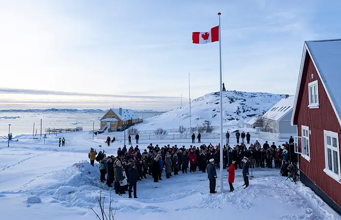 La bandera de Canadá se izó y decenas de personas cantaron “O Canada” mientras la ministra de Relaciones Exteriores, Anita Anand, inauguraba oficialmente el consulado canadiense en Nuuk, que también es la ciudad más grande de la helada isla ártica.