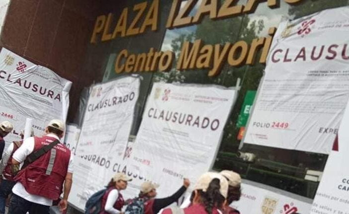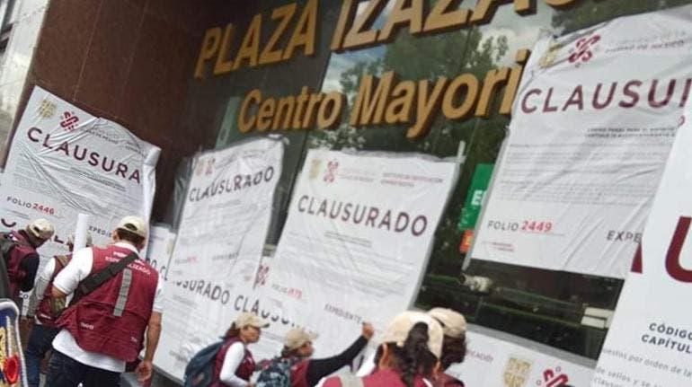 Trabajadores del Instituto de Verificación Administrativa (Invea) clausuraron la Plaza Izazaga 89 luego de diversas denuncias por venta de productos irregulares.