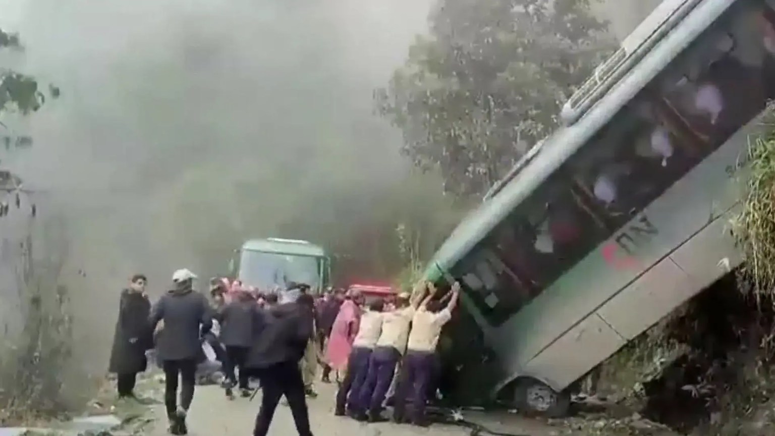 Según las imágenes difundidas, el autobús cayó por una pendiente de unos 15 metros de altura y personal de la empresa del vehículo, lugareños y agentes intentaron detenerlo para evitar que siguiera descendiendo.