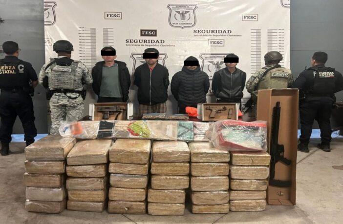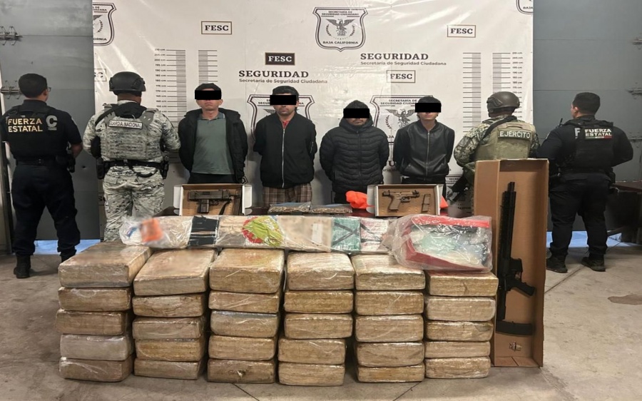 En Baja California, elementos de la Guardia Nacional, el Ejército Mexicano y la Policía Estatal detuvieron a cuatro personas, asegurando un arma larga, dos armas cortas, siete cargadores, 298 cartuchos, 14 kilogramos de fentanilo, 150 kilogramos de marihuana y un vehículo. El valor estimado de la droga incautada asciende a 106 millones de pesos.