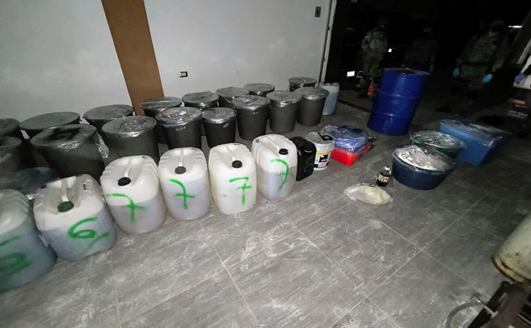 El ejército aseguró en la colonia Prados del Sur, en la capital del estado 98 kilos de metanfetamina, mil 260 litros de la misma sustancia en presentación liquida, 209 cartuchos útiles y dos vehículos.