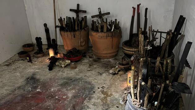 El hallazgo incluyó al menos tres cráneos colocados en una vasija de barro, acompañados de veladoras, artesanías con maderas y cruces, así como una vasija con una imagen que simula una cabeza humana con sangre.