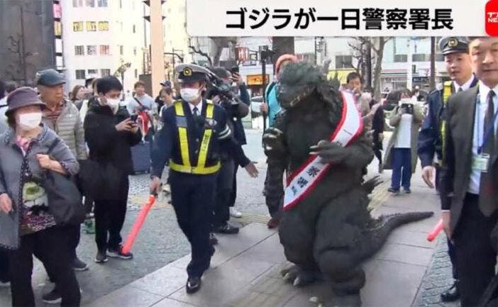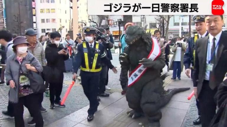 Este gigantesco reptil, famoso por sus apariciones en la pantalla grande, fue seleccionado como el jefe de una estación de policía en Tokio por un día. El video compartido en las redes sociales mostraba a Godzilla recibiendo su banda especial y un diploma, mientras caminaba por las calles para interactuar con la gente.