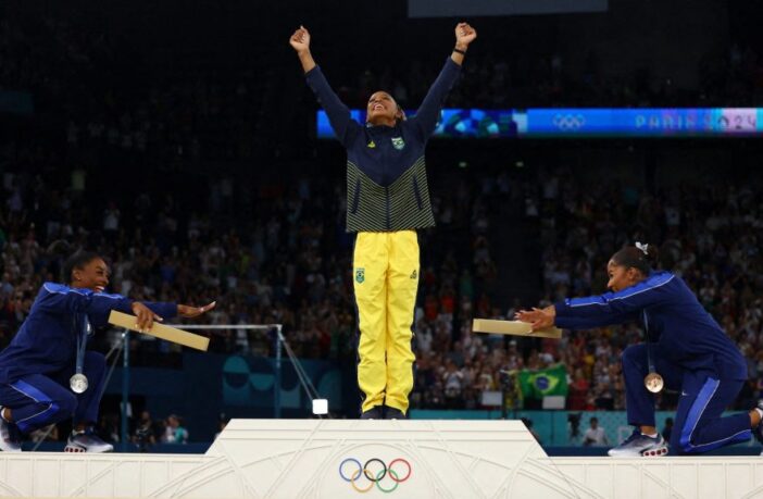 Las gimnastas estadounidenses Simone Biles y Jordan Chiles dejaron una imagen ‘indeleble’ y con carácter de inédita en la historia de los Juegos Olímpicos. Tras ganar plata y bronce en la Final de piso en París 2024, respectivamente, se postraron en el podio para recibir a la brasileña Rebeca Andrade, que ganó el oro en ese aparato.