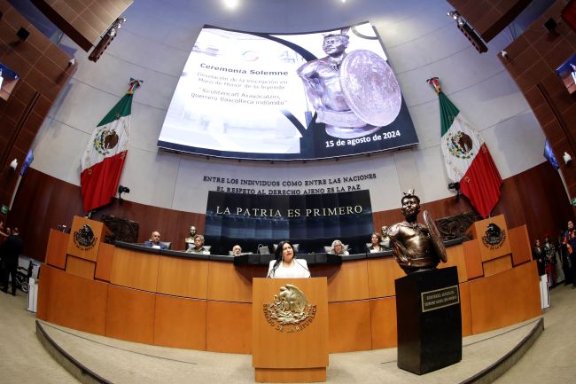 La presidenta de la Mesa Directiva, Ana Lilia Rivera Rivera, encabezó la ceremonia solemne para develar, en el Muro de Honor del Senado, la leyenda “Xicohténcatl Axayacatzin, guerrero tlaxcalteca indómito”, como un símbolo de la resistencia y la dignidad de los pueblos indígenas.
