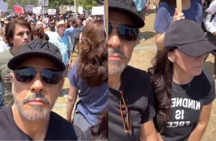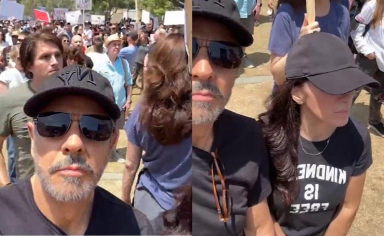 El actor mexicano Eugenio Derbez y su pareja Alessandra Rosaldo se sumaron hoy sábado 14 de junio a las manifestaciones en Los Ángeles para alzar la voz contra las redadas migratorias que se han desatado en la ciudad y en distintas zonas de Estados Unidos, llevadas a cabo por el Servicio de Control de Inmigración y Aduanas (ICE).