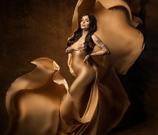 La influencer mexicana Karely Ruiz anunció por todo lo alto que está esperando a su primer bebé, con una postal en la cual aparece vestida con un espectacular vestido dorado.
