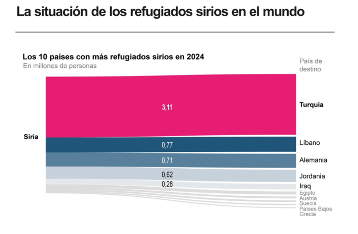 Según datos de ACNUR los desplazados sirios han pedido asilo en más de 130 países, aunque la gran mayoría vive en naciones vecinas dentro de la región: Líbano, Jordania, Irak, Egipto y sobre todo Turquía, donde hay unos 3 millones.