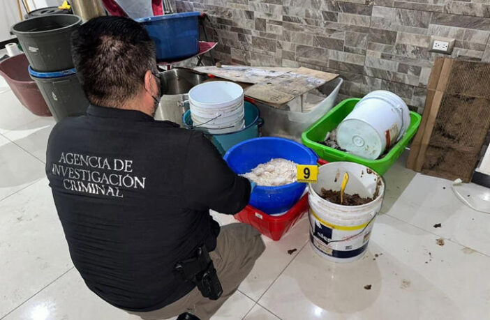 Incautan metanfetamina y cartuchos de uso exclusivo en Sinaloa. Foto: Especial La Fiscalía General de la República (FGR) informó que tras un cateo en inmueble ubicado en la colonia Prado del Sur, en Culiacán, Sinaloa, se incautaron alrededor de mil 220 litros de metanfetamina en estado líquido, 95 kilogramos de la misma sustancia, 2.5 litros de distintas sustancias y tres kilos de perkadox.