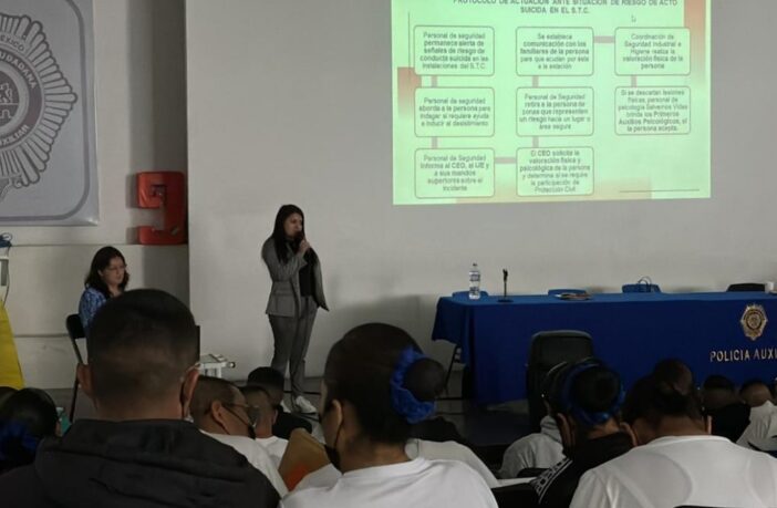 Personal del Metro capacitó a 146 elementos de la Policía Auxiliar de la Secretaría de Seguridad Ciudadana (SSC), en el Programa “Salvemos Vidas”, en el Instituto de Educación Superior de la Policía Auxiliar, quienes estarán adscritos al organismo, por ello la importancia que conozca el protocolo para poder salvaguardar la vida de los usuarios con alguna ideación suicida.