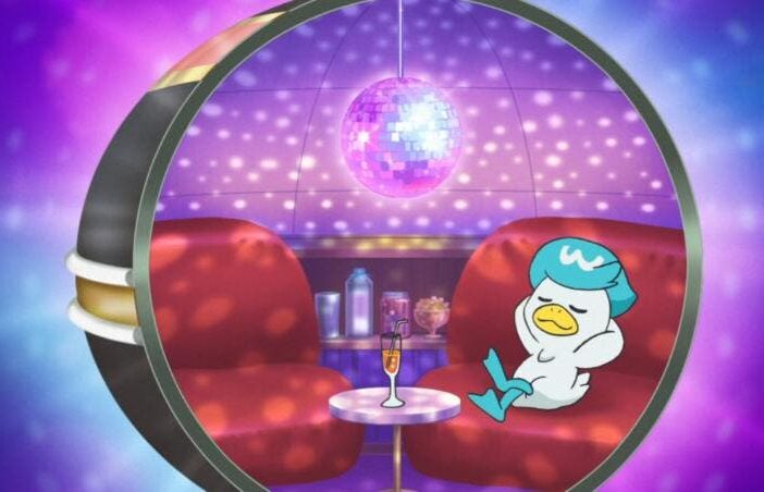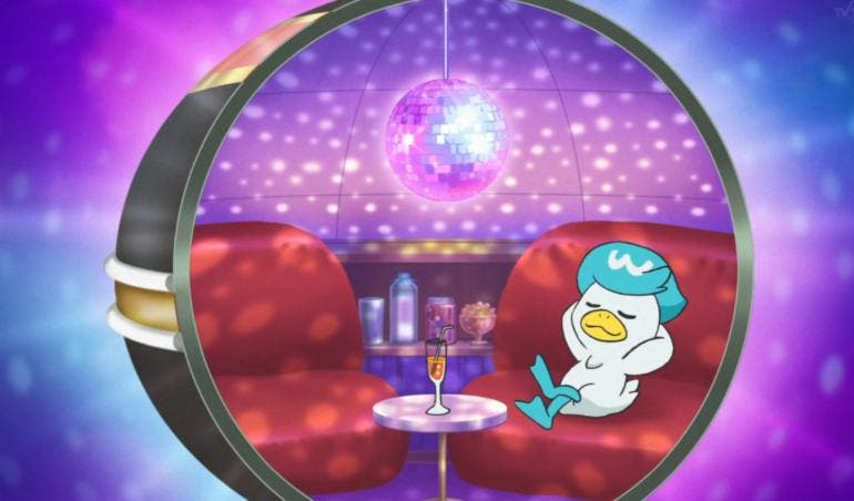 La escena detalla cómo Quaxly disfruta de una experiencia lujosa dentro de la Luxury Ball, descansando en un sofá mientras toma una bebida, bajo el resplandor de una bola de discoteca. Esta representación rompe con las teorías previas de los fans, que imaginaban desde una estasis similar al sueño hasta entornos cómodos y personalizados para cada Pokémon.