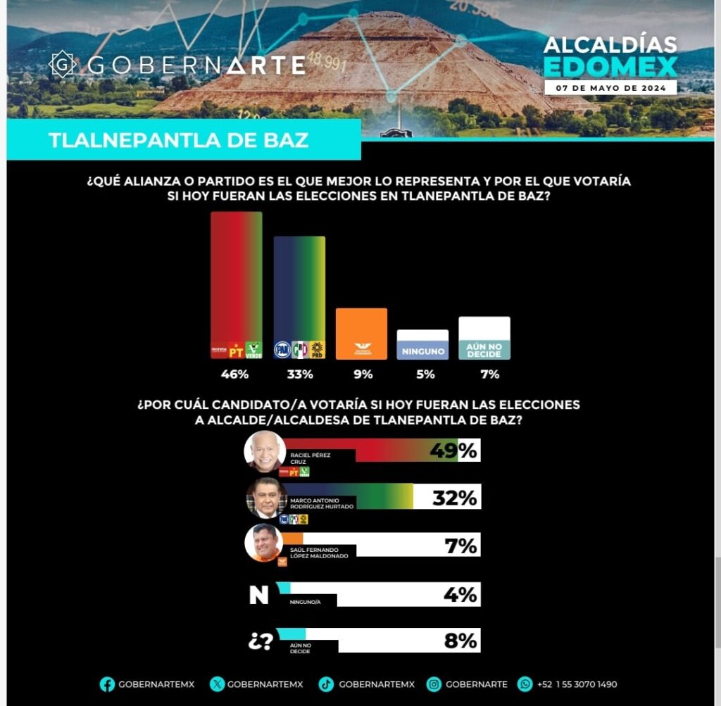 Al corte al 7 de mayo, la casa encuestadora indica que las y los tlalnepantlenses dan a Raciel Pérez 49 por ciento de las preferencias, contra 32 por ciento de Tony Rodríguez, mientras que el candidato de Movimiento Ciudadano (MC), Saúl Fernando López, con 7 por ciento.