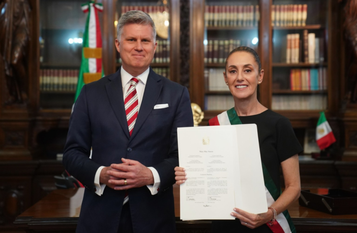 “Hoy tuve el honor de presentar mis cartas credenciales ante la presidenta @claudiashein Le reiteré mi compromiso de profundizar nuestro diálogo con México para acercar más a nuestros países y colaborar por el bienestar de todos nuestros ciudadanos”, escribió el embajador en la red social X, y lo acompañó de una fotografía de ambos en el despacho de la jefa del Ejecutivo en Palacio Nacional.