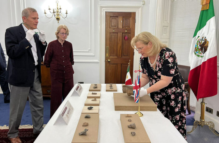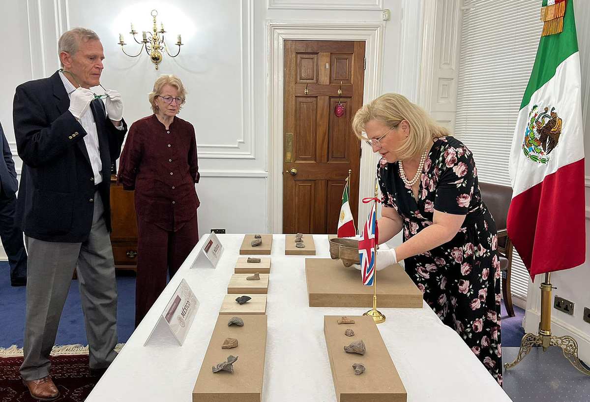 “En la sede de la Embajada de México en el Reino Unido, la embajadora Josefa González-Blanco Ortiz-Mena recibió 19 piezas arqueológicas para su repatriación, como parte de un esfuerzo de restitución voluntaria acordado entre dicha oficina y el ciudadano británico Michael Johnson”, según la fuente.