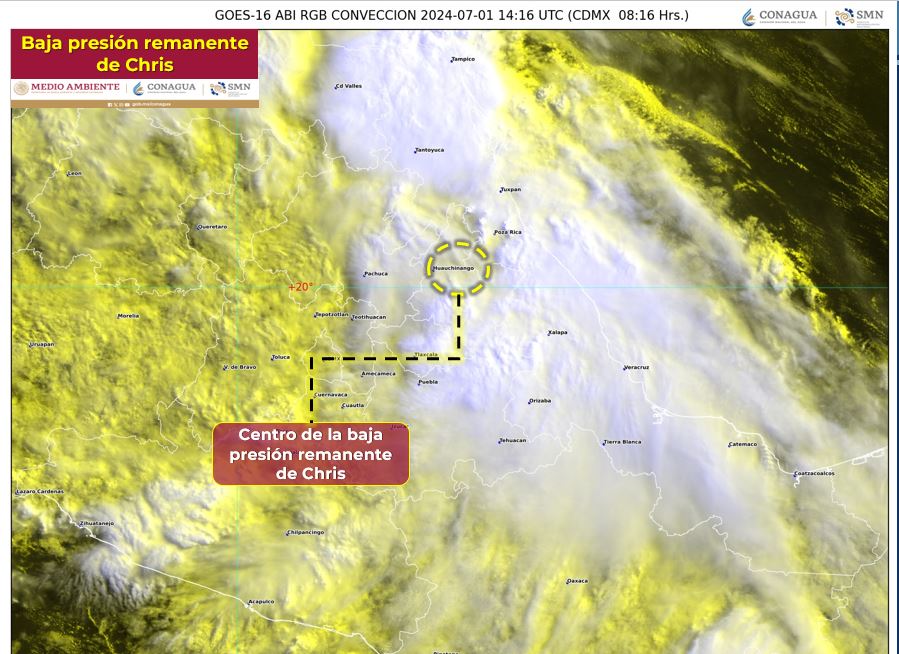 Chris ahora como baja presión remanente, se localiza en tierra al norte del estado de Puebla. El sistema origina lluvias de muy fuertes a puntuales torrenciales en entidades del noreste, oriente y centro del país. Además de vientos fuertes y oleaje elevado en costas de Tamaulipas y Veracruz, avisó el Servicio Meteorológico Nacional (SMN).